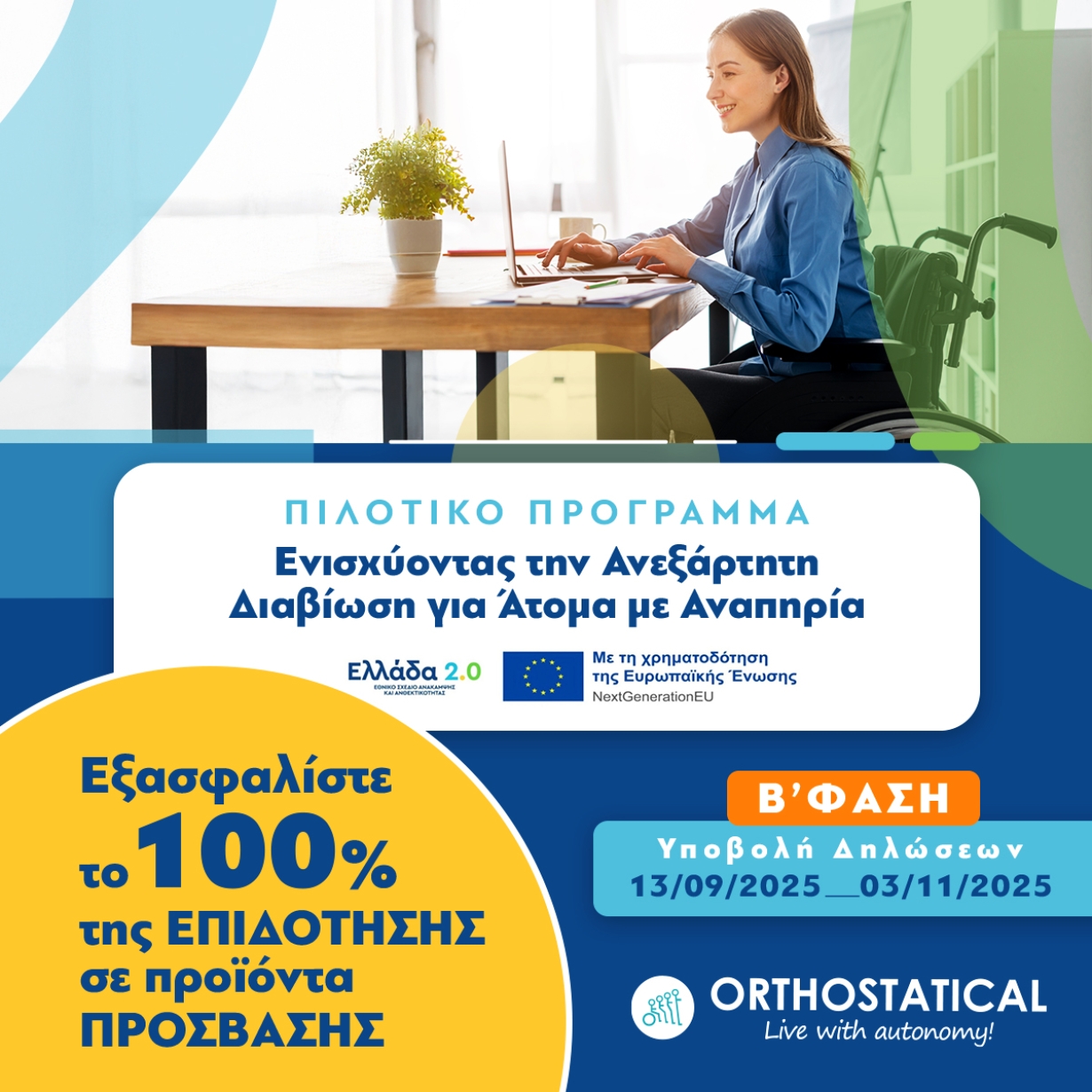 Η πλατφόρμα για τη Β’ Φάση του πιλοτικού προγράμματος «Ενισχύοντας την Ανεξάρτητη Διαβίωση για Άτομα με Αναπηρία» άνοιξε και πλέον οι δικαιούχοι μπορούν να προχωρήσουν στο επόμενο κρίσιμο βήμα για να εξασφαλίσουν το 100% της επιδότησης για παρεμβάσεις και εξοπλισμό που διευκολύνουν την καθημερινότητά τους.